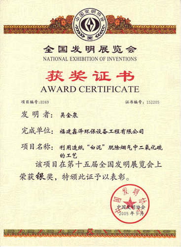 由我公司自主研发的利用造纸“白泥”脱除烟气中二氧化硫的工艺在第十五届全国发明展览会上荣获银奖。