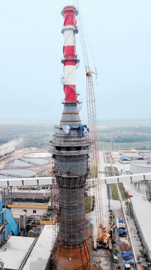 湛江晨鸣浆纸有限公司电厂扩建工程400t/h锅炉烟气脱硫湿电项目,基础交付后,经过近50天的安装,脱硫塔、湿电、直排烟囱90米合一塔于2016年1月30日顺利封顶!目前,合一塔的持液段、烟气进口段、喷淋段、除雾段、湿电段、变径段和直排烟囱的钢结构已全部安装完成;湿电段内玻璃鳞片防腐施工已完成,湿电阳极模块安装也已完成。